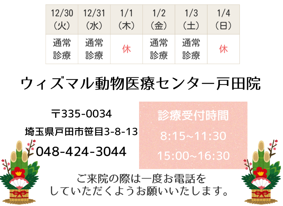 また年末年始について、提携先のウィズマル動物医療センター戸田院が下記のスケジュールで診療しております。